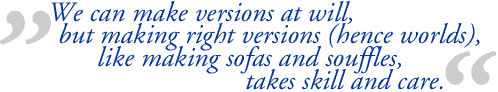 Die in Sprachen der Kunst am Beispiel der Künste entworfene Symboltheorie und ihre erkenntnistheoretische Entfaltung in Weisen der Welterzeugung führen Goodman in dem gemeinsam mit Catherine Z. Elgin verfaßten Band Reconceptions in Philosophy and Other Arts and Sciences (1988; dt.: Revisionen: Philosophie und andere Künste und Wissenschaften) zu einem Vorschlag für eine grundsätzliche "Neufassung der Philosophie". Die Autoren regen an, die philosophisch zentralen Begriffe Wahrheit, Gewißheit und Wissen durch Richtigkeit, Übernahme ("adoption") und Verstehen zu ersetzen. Während 'Wahrheit' strenggenommen nur auf verbale Sätze und dort auch nur auf Aussagen (und nicht etwa auf Aufforderungen, Fragen usw.) zutreffen könne, bilde 'Richtigkeit' ein multidimensionales Kriterium, das auf alle möglichen sprachlichen und auch nichtsprachlichen Symbole zutreffe. Die Wahrheit ist nur einer der Faktoren, die Einfluß auf die Richtigkeit des Gesagten oder Dargestellten haben können; sie ist gelegentlich, aber nicht notwendigerweise Bestandteil der Richtigkeit. In ähnlicher Weise soll 'Gewißheit' bzw. ihre Alternativen wie 'Wahrscheinlichkeit' oder 'Überzeugung', die allesamt ebenfalls nur auf Aussagen zutreffen können, durch den weiter gefaßten Begriff der 'Übernahme' ersetzt werden. Und schließlich ist auch der Begriff des Wissens zu eng für die angeregte Neufassung, denn Wissen bedarf der Wahrheit und der Überzeugung. Dagegen bietet es sich an, den vielseitigeren Begriff des 'Verstehens' zu verwenden, der sich auch beispielsweise auf Bitten oder Fragen, auf Gemälde oder Tänze erstreckt, die weder wahr noch falsch sind, weder dem Beweis noch der Widerlegung unterliegen und von denen man weder überzeugt sein noch sie bezweifeln kann. |
